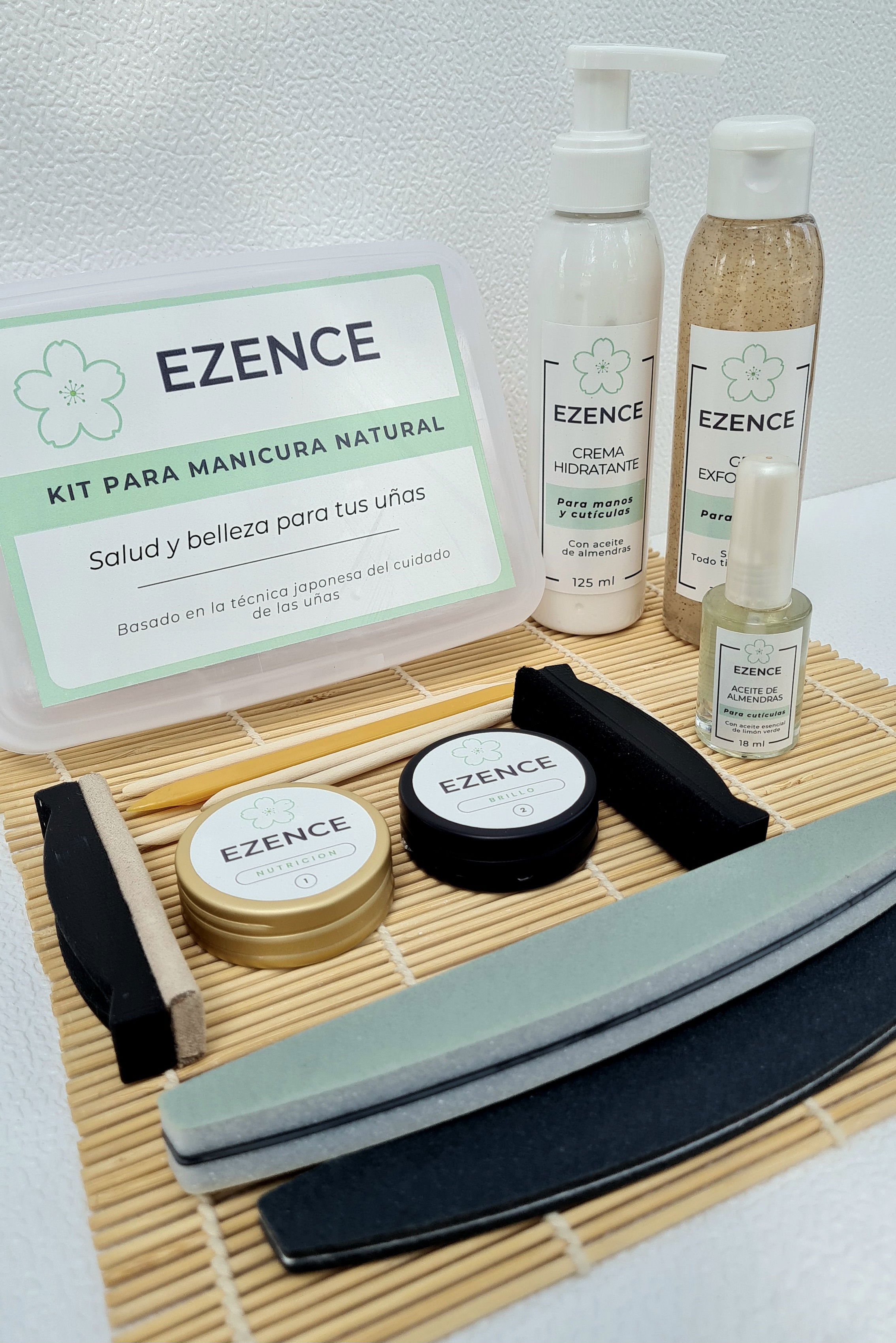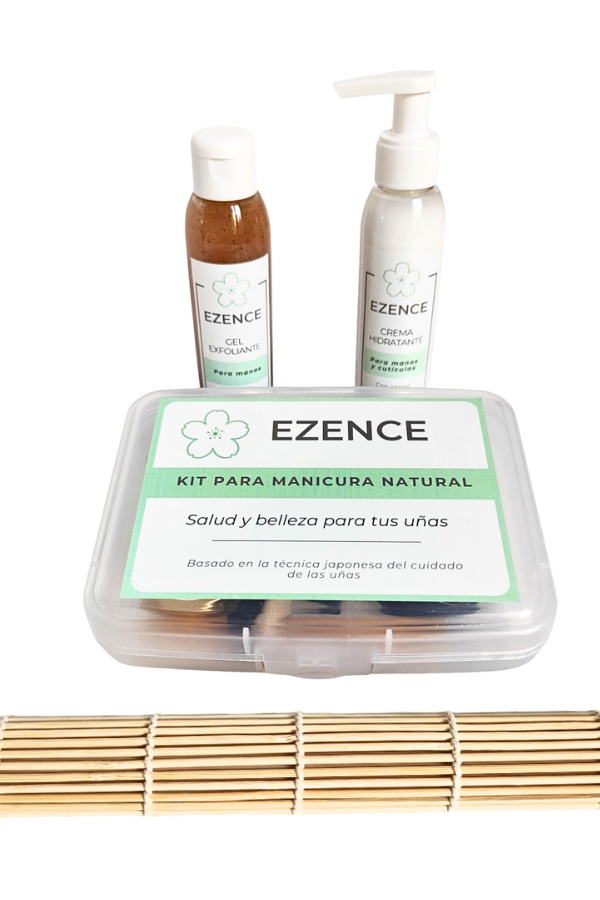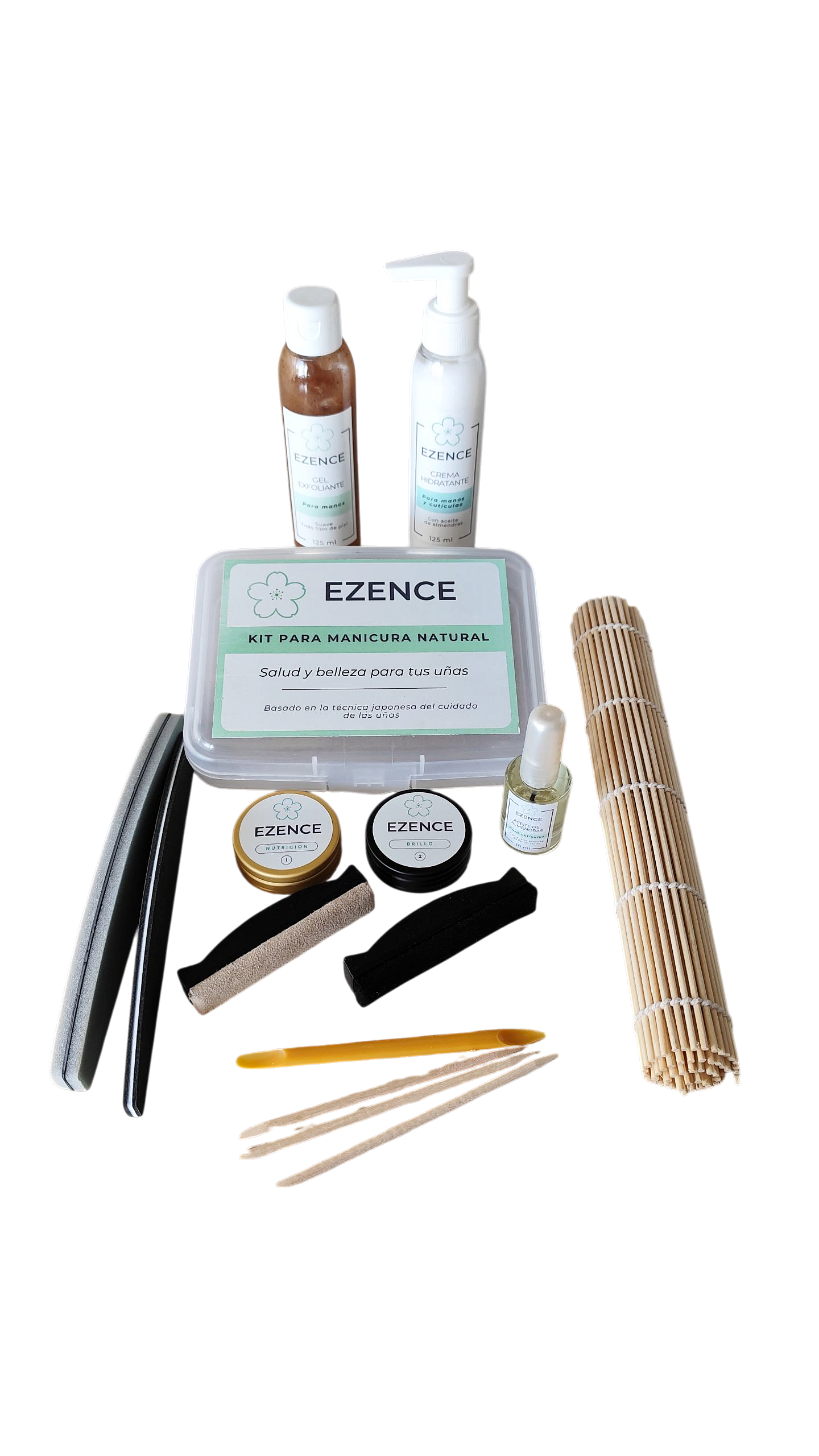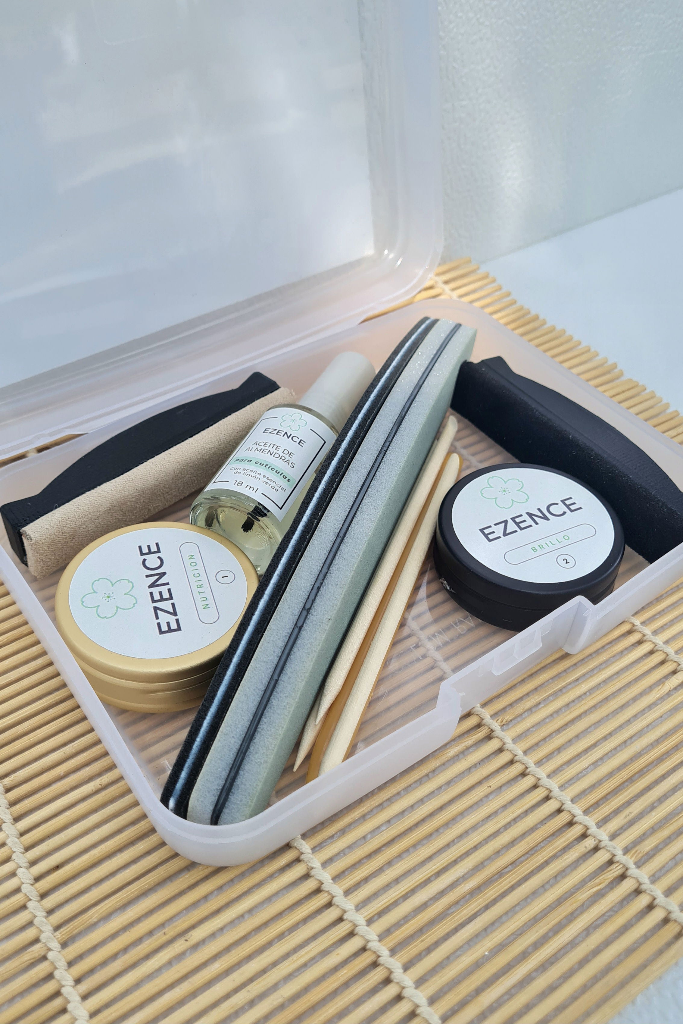 En su interior vas a encontrar los productos naturales, los accesorios para aplicarlos, los accesorios para preparar las uñas, aceite de almendras, crema y exfoliante para manos.